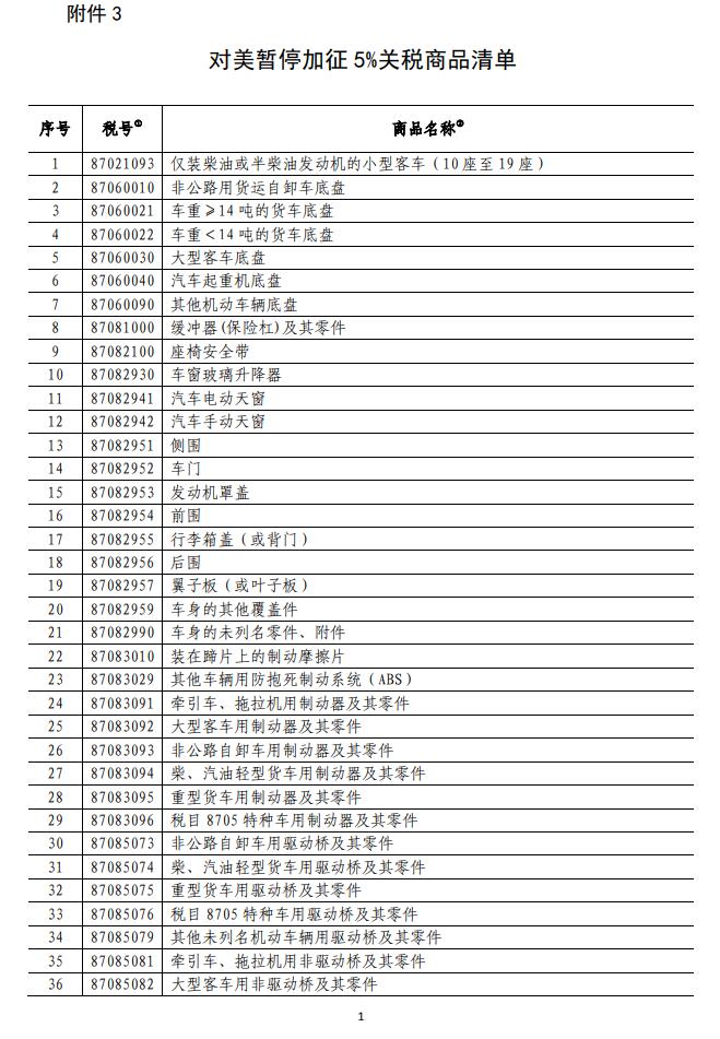 从2019年1月1日起至2019年3月31日,对附件1所列28个税目商品暂停征收《国务院关税税则委员会关于对原产于美国500亿美元进口商品加征关税的公告》(税委会公告﹝2018﹞5号)所加征25%的关税;对附件2所列116个税目商品暂停征收《国务院关税税则委员会关于对原产于美国约160亿美元进口商品加征关税的公告》(税委会公告﹝2018﹞7号)所加征25%的关税;对附件3所列67个税目商品暂停征收《国务院关税税则委员会关于对原产于美国约600亿美元进口商品实施加征关税的公告》(税委会公告﹝2018﹞8号)所加征5%的关税,具体商品范围分别见附件1-附件3。