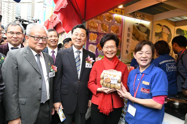 林鄭與多位嘉賓在開幕禮結束後,亦到會場參觀,與攤檔檔主交流。林太第一站先去買了多包鹹蛋黃酥餅、魷魚絲、全麥餅等,又買一樽焦糖味爆米穀。林太買完之後又「轉戰」臘味貨,買了一包鵝肝腸、18條臘腸、12條腸及臘肉,還有20隻臘鴨髀,單計臘味就花費1528元。她另外亦花了超過600元買蝦子麵、素菜麵和雲腿瑤柱麵等,及一共4包、總值200元的椎茸。她笑言稍後會招待小朋友到訪禮賓府,食物是買來給小朋友吃。