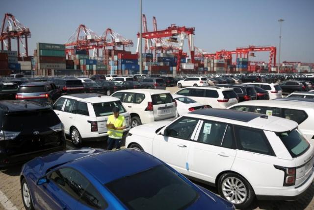 山东青岛港口工作人员为进口车登记(图源:路透社)