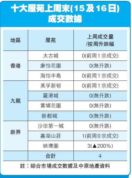 中原地產十大屋苑上周末錄得4宗成交,按周無升跌。其中成交來自映灣園及嘉湖山莊,其餘8個屋苑沒有錄得成交。根據美聯物業統計,上周末十大屋苑交投量錄得僅3宗買賣成交,較前周的4宗,下跌25%。上周數字創6個周末新低,其中8個屋苑零成交。