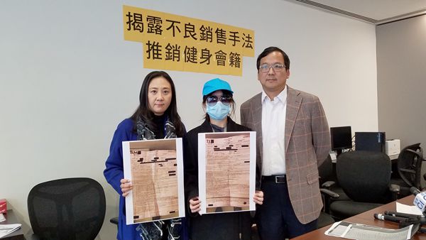陳小姐(化名)(中)講述疑墮買健身會籍陷阱情況,在旁的葛珮帆(左)狠批不良營銷手法。記者 何加祺攝