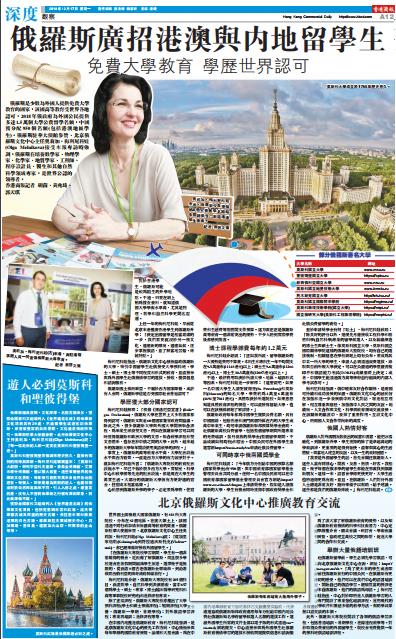 俄羅斯是少數為外國人提供免費大學教育的國家,該國高等教育受世界各地認可,2018年俄政府為外國公民提供多達1.5萬個大學公費留學名額,中國獲分配950個名額(包括港澳地區學生)。俄羅斯駐華大使館參贊、北京俄羅斯文化中心主任奧莉加‧梅利尼科娃(Olga Melnikova)接受本報專訪時強調,俄羅斯在培養數學家、物理學家、化學家、地質學家、工程師、程序設計員、醫生和其他自然科學領域專家,是世界公認的領導者。
