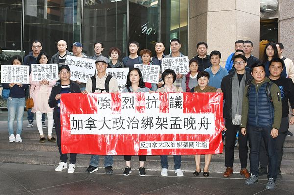 目前孟晚舟已獲加拿大法庭批准保釋,但行動範圍仍受限制。有市民自發組成「反加拿大政治綁架關注組」,昨午一行20多人帶同橫額及標語到加拿大駐港澳總領事館示威抗議,要求加拿大政府不要再為虎作倀政治綁架孟晚舟。各人高呼口號「還孟晚舟清白,加國必須道歉」。