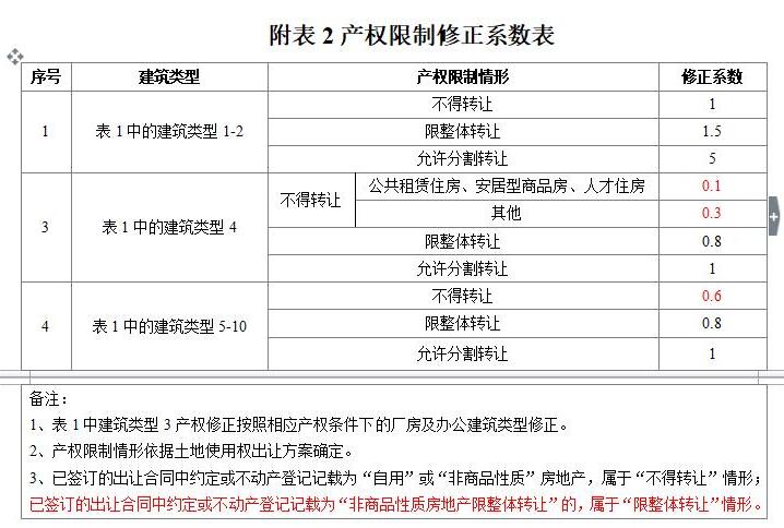 针对不同产权限制的用地,《测算规则》(试行)中已有部分规定,本次《测算规则》(修订稿)对试行稿中产权限制的各类情形进行了系统的归纳,新增了“附表2产权限制修正系数表”,结合“附表1 建筑类型适用地价标准及修正系数表”,“附表3 产业发展导向修正系数表”及“附表4 产业项目类型修正系数表”共同使用,能够大幅降低不得转让性质产业用地地价水平,充分体现对实体经济的政策支持。