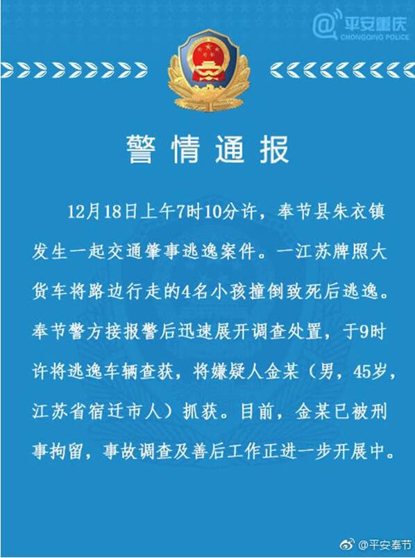 据奉节县公安局官方微博“平安奉节”通报,12月18日上午,奉节县朱衣镇发生一起交通肇事逃逸案件,一江苏牌照货车将路边行走的4名小孩撞倒致死后逃逸。