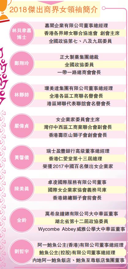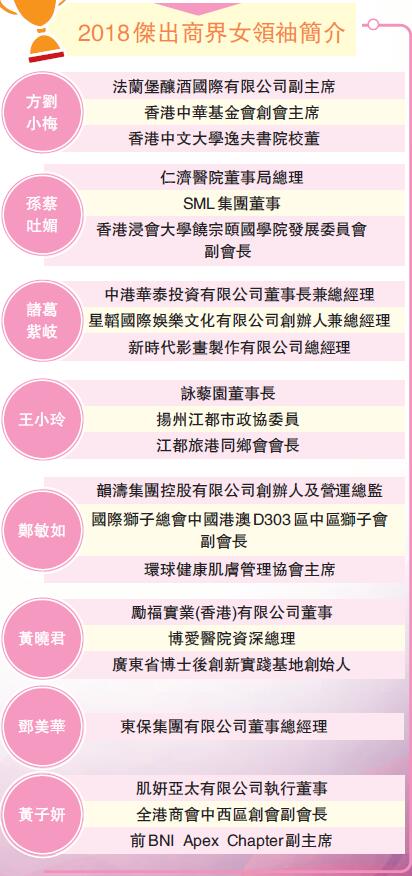 我很感謝《香港商報》對我過去多年來在社會工作和行業發展上的貢獻給予的肯定和鼓勵,選出我成為2018傑出商界女領袖,我感到非常榮幸。