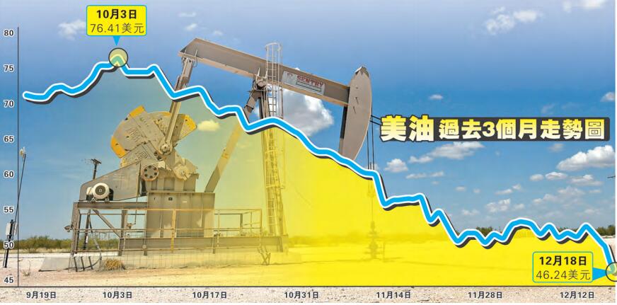 【香港商報网訊】隨着油價周二再次暴跌逾7%,美油價較10月初的四年最高位大跌近40%。自11月初以來,美油已出現四次單日跌幅超過6%的慘烈行情,目前投機性多倉降至兩年多最低水平。有分析員認為,美油可能跌向2017年最低谷的區域,即接近42美元。