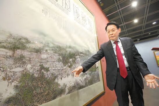 图说:香港美協主席蕭暉榮介紹他的畫作《滄桑歲月圖》。