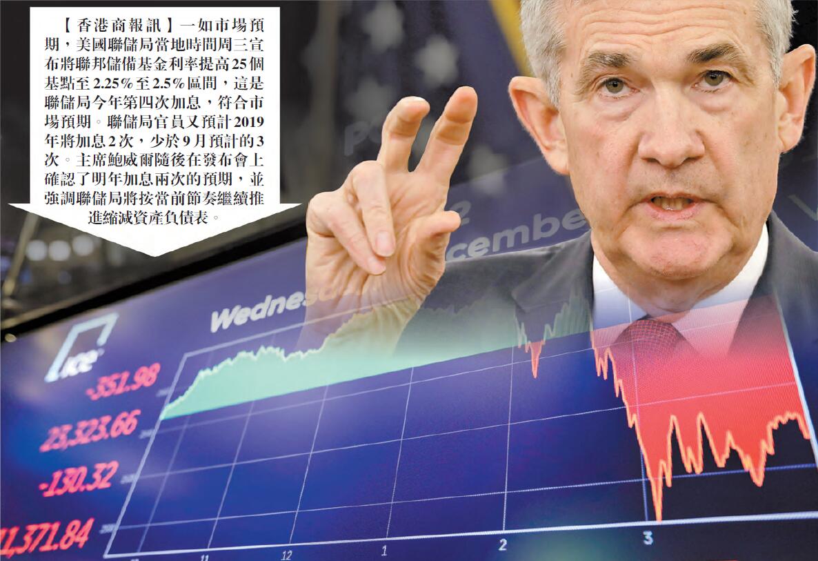【香港商報网訊】一如市場預期,美國聯儲局當地時間周三宣布將聯邦儲備基金利率提高25個基點至2.25%至2.5%區間,這是聯儲局今年第四次加息,符合市場預期。聯儲局官員又預計2019年將加息2次,少於9月預計的3次。主席鮑威爾隨後在發布會上確認了明年加息兩次的預期,並強調聯儲局將按當前節奏繼續推進縮減資產負債表。