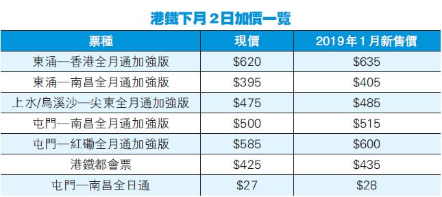 港鐵宣布,5款「全月通加強版」將會加價,其中「東涌-香港全月通加強版」、「屯門-南昌全月通加強版」、「屯門-紅磡全月通加強版」均會加價15元,加幅介乎2.4至3%;「上水/烏溪沙-尖東全月通加強版」及「東涌-南昌全月通加強版」則加價10元,升幅分別為2.1%及2.5%。