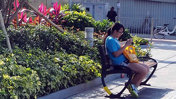和暖的冬至有市民在公園穿着短褲T恤休息。