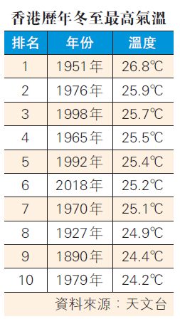 其中,天文台在青衣、大美督錄得26度;屯門、石崗、荃灣、九龍城、黃大仙、深水?、打鼓嶺亦錄得27度;元朗甚至錄得28度的「高溫」。而25.2度的數字,是本港繼1998年的25.7度後最高溫的「冬至」日。而從整體來看,昨日的溫度是天文台自1884年來,第6高溫的「冬至」。今年本港入冬以來,天文台仍然未發出過寒冷天氣警告。