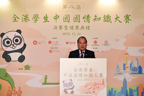 張建宗在全港學生中國國情知識賽頒獎禮上致辭。