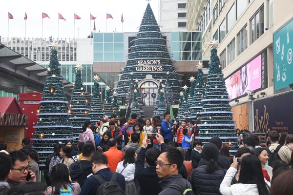 昨日平安夜,全港到處洋溢節日氣氛,一向人山人海的尖沙咀更顯熱鬧,幾乎所有名店門口都大排長龍,旅客大都大袋小袋滿載而歸,不少內地旅客即使請假都要來港感受一下聖誕氣氛。其中,1881Heritage、尖沙咀海傍及海港城門外都擠滿了人拍照「打卡」,令人幾乎忘記當天並非公眾假期。