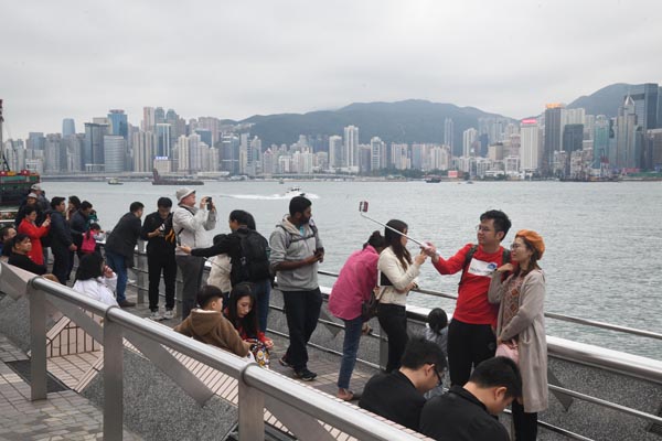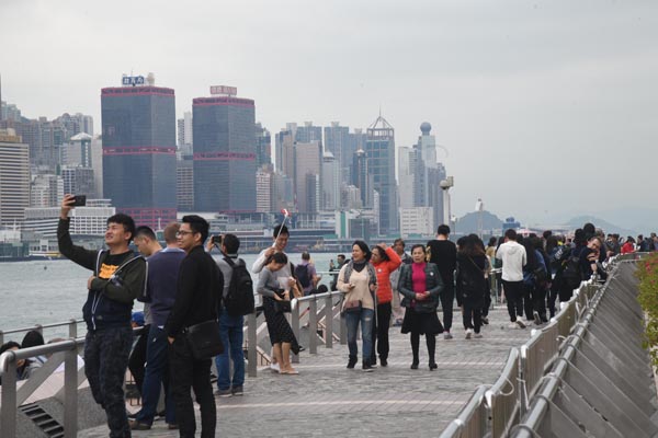不少旅客和市民也走到尖沙咀海濱長廊欣賞維港美景並拍照留念。記者 蔡啟文攝