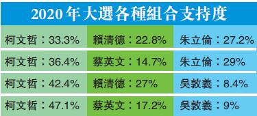 據《美麗島電子報》昨日公布最新民調,2020大選支持度,依序為新北市長朱立倫39.8%、行政院長賴清德37.1%、台北市長柯文哲36.4%、前立法院院長王金平20%、台灣地區領導人蔡英文19.%、前行政院長張善政15.3%、前台灣地區領導人馬英九13.4%、國民黨主席吳敦義7.%。未明確回答的有18.9%。