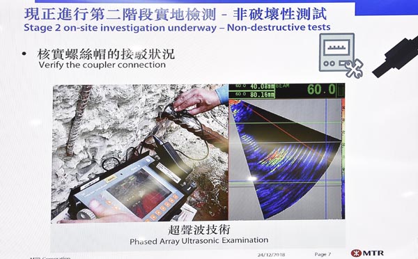 對於有意見認為港鐵應扭出整條鋼筋作檢驗有否被剪短,港鐵外聘的獨立專家顧問嚴建平直言該方法「極具破壞性」,是不合理、不切實際,重申現時採用的超聲波檢驗方法,毋須破壞結構安全。他進一步解釋,想將鋼筋扭出有兩個方法,一是「好大力扭」,但有機會「扭爛」旁邊石屎;另一方法是將螺絲帽剪出,然後將螺絲頭扭出來,但當工程人員把螺絲帽放回原位時,將難以用燒焊方式,因熱力會影響強度。