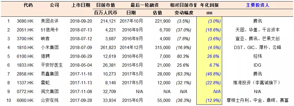 港股十只“科技独角兽”最后一轮投资人的投资收益(图片来源:青兰研究)