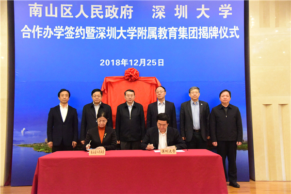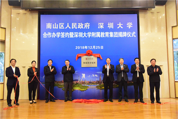 【香港商报网讯】记者林丽青报道:12月25日,深圳大学与深圳市南山区人民政府合作办学签约仪式暨深圳大学附属教育集团成立揭牌仪式在深圳市南山区政府举行。深圳大学附属教育集团宣告成立,该教育集团所属学校包括一所初中、四所小学、三所幼儿园。深圳大学党委书记刘洪一、深大校长李清泉,南山区委书记王强、深圳市教育局副局长赵立等为深圳大学附属教育集团揭牌。据透露,深圳大学教育发展基金会及相关企业将筹措成立深圳大学基础教育发展基金,用于教育集团奖教奖学。