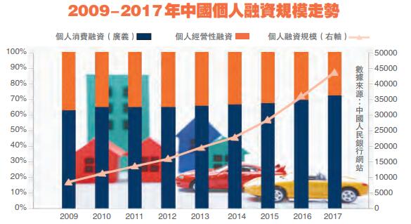 報告認為,2009年到2017年,中國個人融資進入「大發展」階段。金融機構提供的消費信貸品種從以前的單純住房消費貸款,進一步擴大到助學貸款、住房裝修貸款、醫療貸款、旅遊貸款、個人綜合消費信貸等多個品種。2008年底,中國個人融資規模為6萬億元左右,而在多重政策支持下,2017年中國整體個人融資規模已接近45萬億元。