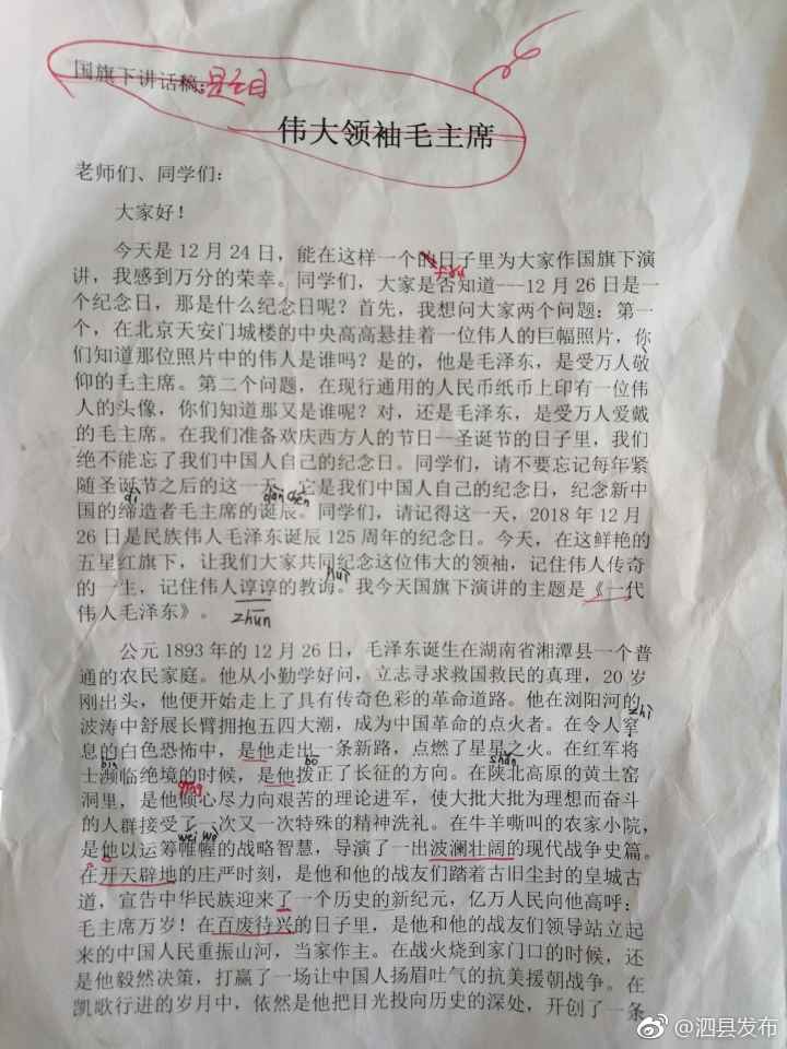 升旗仪式上,四(3)班学生进行了题为《伟大领袖毛主席》的国旗下讲话。毛泽东的一生是传奇的一生。从一个普通的农家孩子,成为中国革命的点火者,在令人窒息的白色恐怖中,是他走出了一条新路,点燃了星星之火。正是他领导中国人民重振山河、当家做主,也是因为他,才有了我们今天的幸福生活。所以作为新时代的小学生,我们要时刻铭记革命先辈的付出,好好学习,以实际行动向着奋进的目标前进。校长董学丰又进行了《圣诞节是中国人的耻辱》的讲话。他从中国屈辱的历史开始,告诉同学们所谓的圣诞节、平安夜、狂欢日的来历,也正是它带给了中国奇耻大辱。同时董学丰进一步号召所有学生要铭记伟人毛泽东,12月26日是毛泽东主席的诞辰日,只是一个值得我们所有中国人铭记的日子,不忘国耻,砥砺前行。