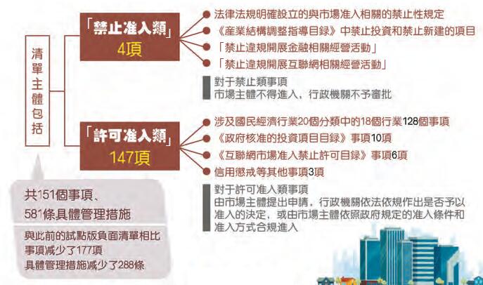 《市場准入負面清單(2018年版)》主體包括「禁止准入類」和「許可准入類」兩大類,一共有151個事項、581條具體管理措施。與試點版負面清單相比,2018年版負面清單事項減少177項,具體管理措施減少288條,大幅壓減54%。值得一提的是,其中許可准入147項,禁止准入僅有4項。