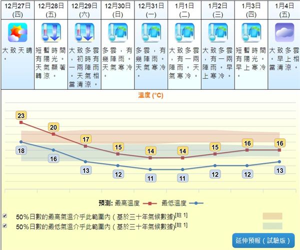 至於市民都十分關心的大除夕星期一(31日),預測多雲,有幾陣雨。天氣寒冷,氣溫介乎11至14度。當晚有跨年煙花匯演,預測吹北風4至5級,離岸間中6級。而星期二元旦,預測大致多雲,有一兩陣雨。天氣寒冷。氣溫繼續低位徘徊,介乎11至14度。