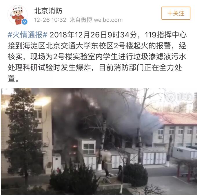 12月26日9时34分,北京市119指挥中心接到报警,北京交通大学东校区2号楼一实验室发生爆炸,消防部门立即调派8个消防中队、30部消防车赶赴事故现场处置。同时,市公安、应急管理、教育、卫生等部门和海淀区政府赶赴现场开展救援和应急处置工作。10时20分,火情得到控制。