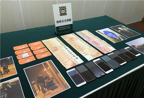 司警展示搜获赃款及行动时拘捕匪徒的照片。