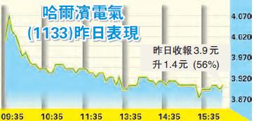 【香港商報网訊】記者呂希蘊報道報道:哈爾濱電氣(1133)獲母公司高溢價提全購及私有化,昨日復牌股價應聲飆逾63%,高見4.09元,最終收報3.9元,升56%(1.4元)。