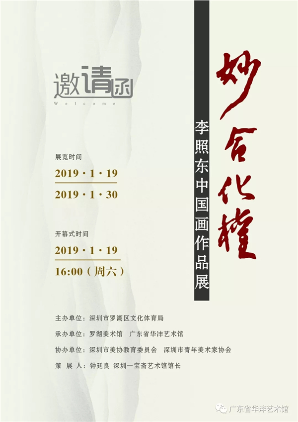 广东省华沣艺术馆诚邀您莅临《妙合化权》-李照东中国画作品展,该馆坐落在深圳市罗湖区新秀路金枫花园首层,于2015年4月7日经广东省民政厅批复挂牌,集展览、收藏、文物鉴赏研究等文创产业于一体,是文化名人的汇聚场馆,也是文化作品和公共文化事业的综合性服务平台。