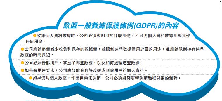 大數據時代,個人資料有價有市,為加強保障用戶個人私隱,2018年5月歐盟國家實施「一般數據保護條例」(GDPR, General Data Protection Regulation),適用於每個可能接觸歐盟公民的企業以及非營利組織、政府機構,因此影響範圍不僅限於歐盟。香港法律界人士及學者大都認為香港在保護個人私隱的條例上落後,需要急起直追歐洲的腳步,尤其應該提高懲罰金額。