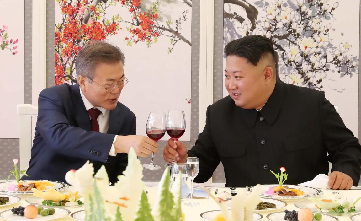 9月20日,朝韓首腦在朝鮮舉行第三次峰會,也是韓國總統文在寅首次訪朝。朝鮮領導人金正恩在兩江道三池淵賓館設宴,並與文在寅祝酒。 資料圖片