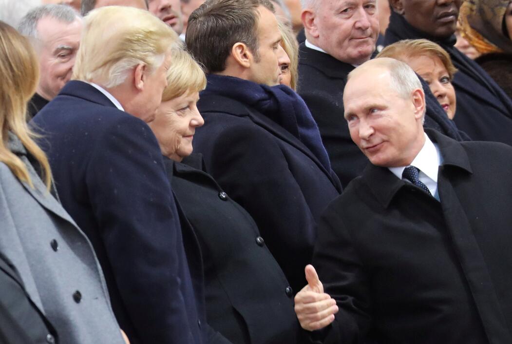 11月11日,法國舉行一戰停戰百年紀念活動。俄羅斯總統普京在拍團體照時,突然向美國總統特朗普豎起拇指,並上前跟他握手。 資料圖片