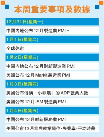 展望2019年1月,美國政府機構「停擺」問題能否解決,以及本周五公布最新「財新中國服務業採購經理指數」表現,將牽動港股本周後期走勢。此外,英國首相文翠珊將於1月中旬或稍後時間,再度提交「脫歐」方案予國會表決,預料表決前後,全球股市將轉趨波動。