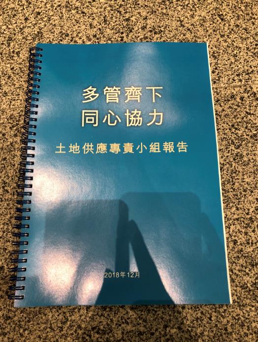 經過長達5個月的「土地大辯論」後,土地供應專責小組由正副主席黃遠輝及黃澤恩作代表,早上向特首林鄭月娥提交過百頁的終極報告,兩人下午2時30分向公眾公開報告內容。報告以藍色作封面,題為「多管齊下、同心協力」。報告指出,香港長遠缺乏至少1200公頃土地,因此建議3個短中期土地選項,和5個中長期選項。
