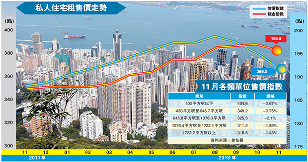 【香港商報網訊】記者鄭珊珊報道:樓價漫長的升勢終於「斷纜」。差估署昨公布,11月全港私人住宅樓價指數跌3.5%,報366.3點,自去年7月起連跌4個月,累計跌7.2%。去年11月租金指數錄195.9點,9個月的升幅終於結束,按月跌0.76%。