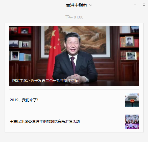 「香港中聯辦」今天正式上線,第一天上線分別刊出《國家主席習近平發表二〇一九新年賀詞》、《2019,我們來了》以及《王志民出席香港跨年倒數煙花音樂匯演活動》三篇文章。