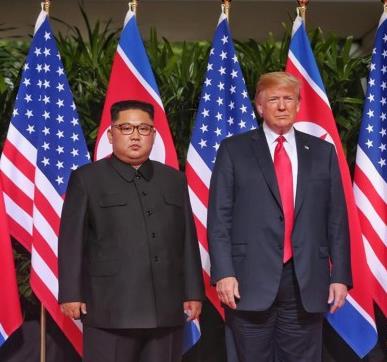 资料图:朝鲜最高领导人金正恩(左)与美国总统特朗普在新加坡举行会晤。