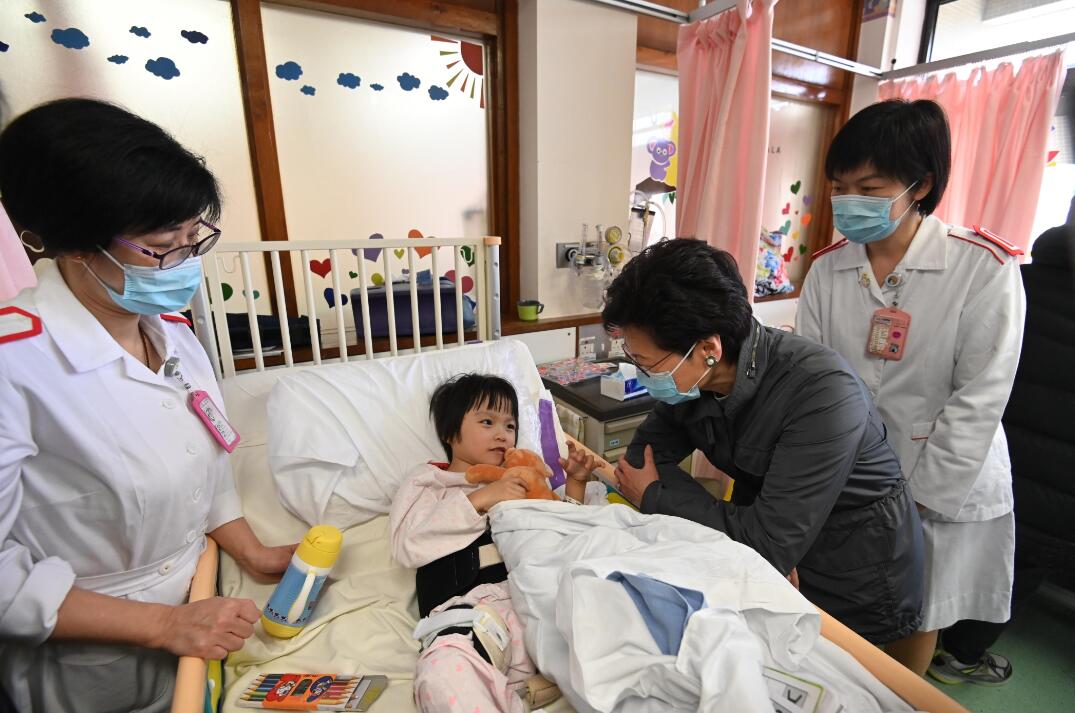 林鄭月娥昨上午到訪屯門醫院,向在場的醫護人員和病人送上新年祝福。圖為林鄭月娥到兒童及青少年科病房探望。政府新聞處