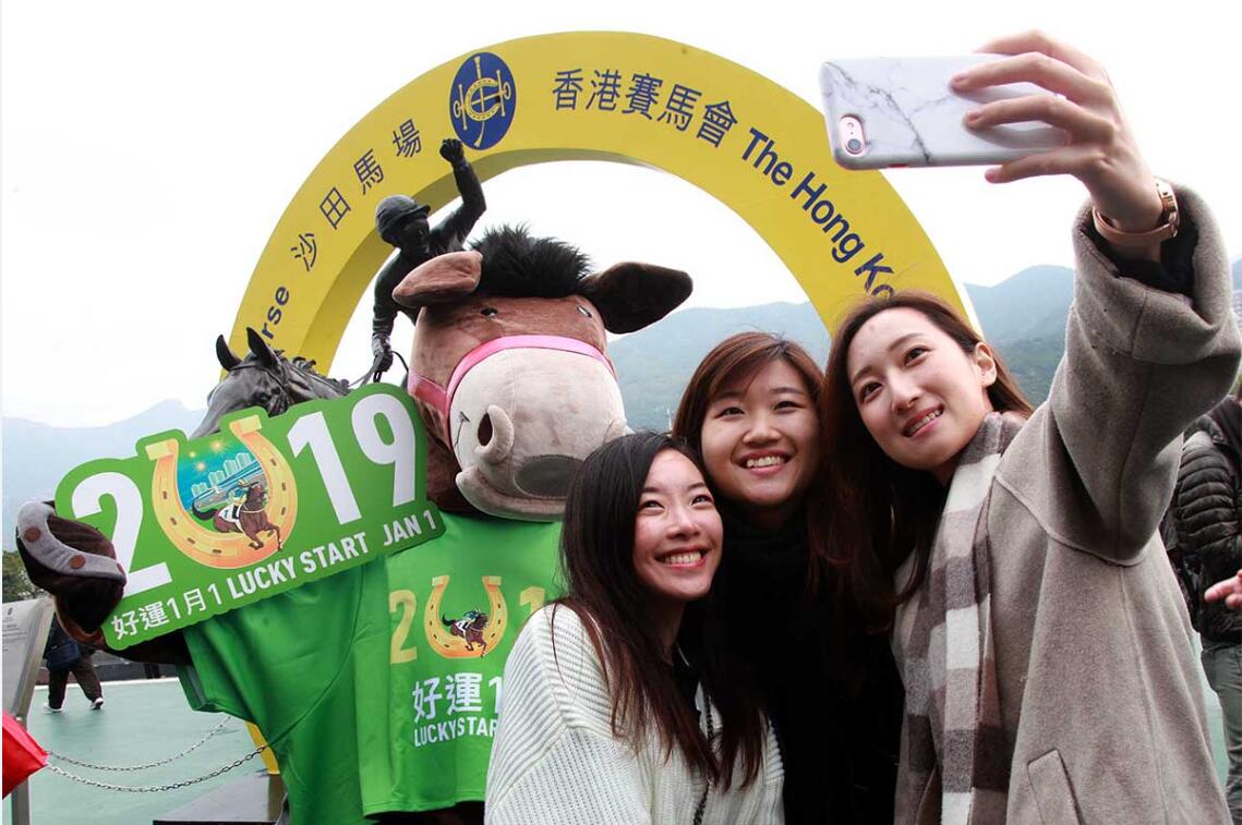 沙田馬場昨元旦日舉辦「好運1月1賽馬日」,合共11場賽事。入場人士皆可獲贈「好運手提袋」一個。雖然天氣嚴寒,仍有不少馬迷與旅客入場發新年財,又或與吉祥物合照,沾沾旺氣。