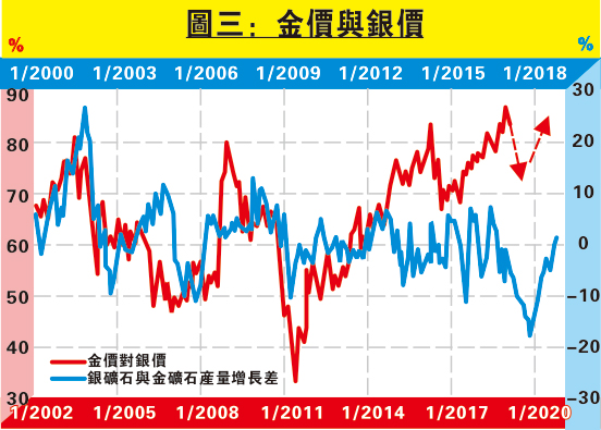 然而,白銀投資價值與黃金相若,但白銀的應用比黃金更廣泛。圖三可見,金礦石與銀礦石的產量按年增長走勢長線而言大部分時間相近,不過2016年出現明顯變化,銀礦石一度供應緊張。再看金銀比例,可見其走勢與銀金礦石產量增長差大致呈正比,後者更領先前者約兩年,儘管2012年至2014年一度出現短暫背離。如按紅箭預示,料金銀比例在未來兩年先跌後升。換言之,白銀在未來一年應見追升壓力,然後便回落。若按上述推測,金價半年目標1340美元,以金銀比例約在75計,估計白銀先上試17.9美元。