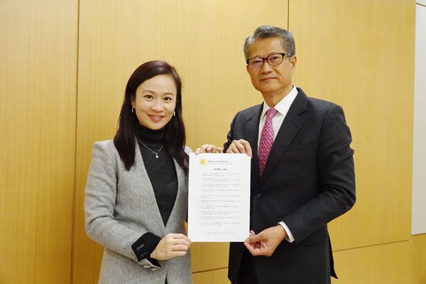 陳凱欣(左)向財政司司長陳茂波提意見。