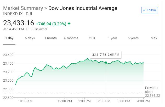 美东时间1月4日16:00(北京时间1月5日04:00),道指涨746.94点,或3.29%,报23433.16点;标普500指数涨84.05点,或3.43%,报2531.94点;纳指涨275.35点,或4.26%,报6738.86点。