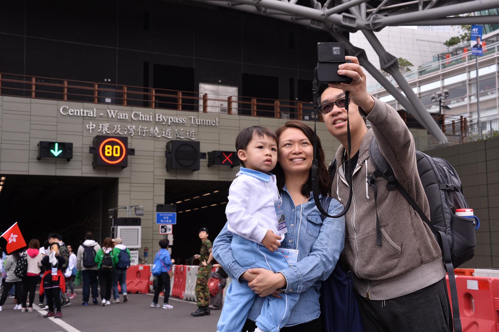 參加者在步入「中環及灣仔繞道」前,紛紛拍照留念。不少參加者帶同小朋友參加,希望小朋友親身體驗慈善活動。
