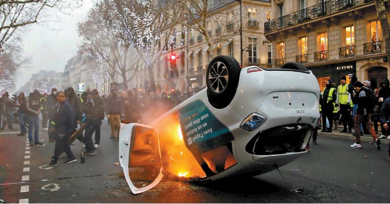 示威者在巴黎市中心的街区点燃一辆汽车,他们还设置路障,点燃垃圾,阻碍警方和消防车辆维持秩序。路透社