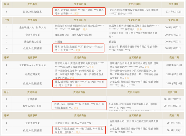 据统计,截止目前,马云和谢世煌已5次转让“阿里系”公司股权。包括2018年1月10日,两人退出浙江天猫网络有限公司股东名单;同年5月23日,两人退出杭州阿里科技有限公司;同年7月16日,两人退出阿里云计算有限公司; 同年12月27日,两人退出杭州阿里巴巴广告有限公司;2018年1月4日,两人退出浙江淘宝网络有限公司。