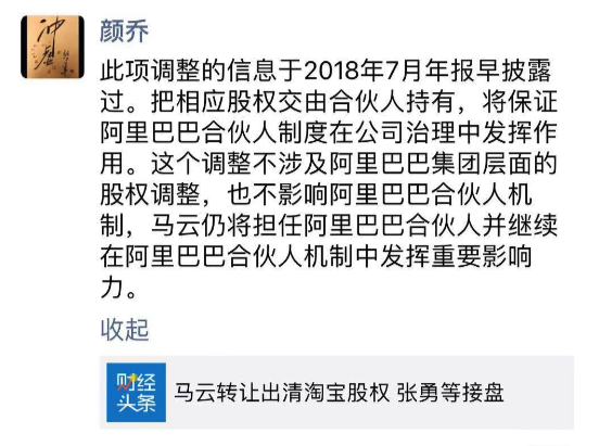 此项调整的信息于2018年7月年报早披露过。把相应股权交由合伙人持有,将保证阿里巴巴合伙人制度在公司治理中发挥作用。这个调整不涉及阿里巴巴集团层面的股权调整,也不影响阿里巴巴合伙人机制,马云仍将担任阿里巴巴合伙人并继续在阿里巴巴合伙人机制中发挥重要影响力。