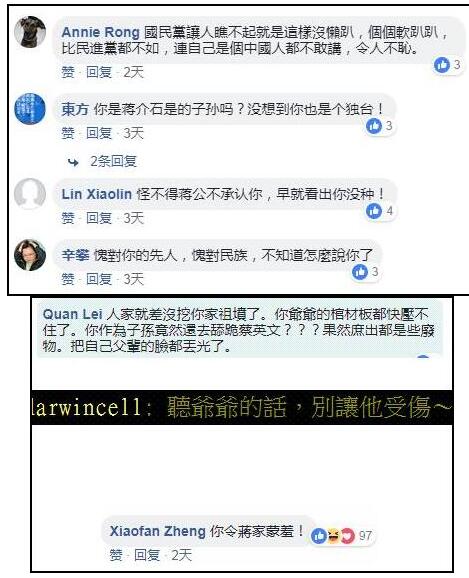 结果此番言论遭台湾网民“狂喷”,连日来蒋万安脸书(Facebook)遭国民党支持者等网友“洗版”,网民要求他“干脆退出国民党,加入民进党”,更有甚者直言“你对不起你祖宗啦!”。