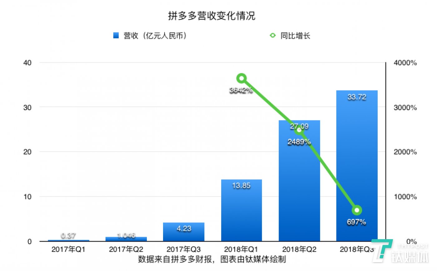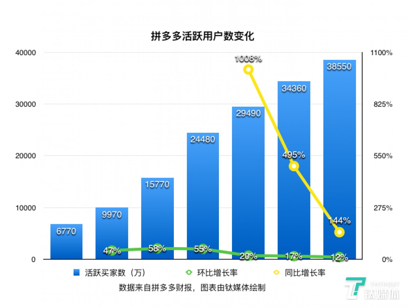 在各项基础设施全部就位的情况下,却有了大批长尾商家从大平台上溢出、底线市场一度真空。当所有人的注意力都放在“新中产”、头部平台身上时,拼多多的突然出现让很多人都感到有些错愕,而它成长速度是令人咂舌的。